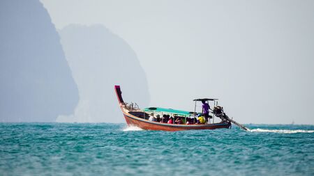Phang Nga, Thailand - January 2018: Long-tail boat floating in Andaman Sea. Emerald water with mountains in the distance
