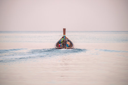 Long tail boat sailing in a calm sea in the early hours of the morning