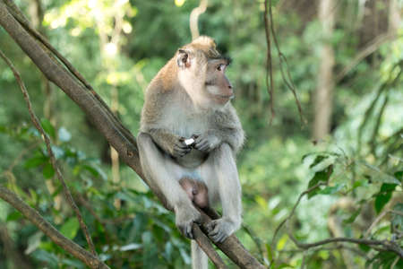 Monkey macaque in the rain forest. Monkeys in the natural environment. Bali, Indonesia. Long-tailed macaques, Macaca fascicularis