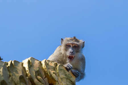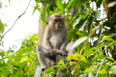 Portrait of interest monkey on tail. Crab-eating macaque or the long-tailed macaque, Macaca fascicularis