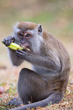 Funny macaque monkey with dirty paws eats banana. Selective focus, blurred background. front view. horizontal image.