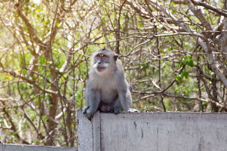 Monkey sitting on the fence. Portrait of old monkey be inattentive and sitting at the concrete fence