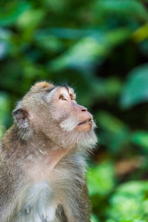Close up shot of adorable monkey with nature background. Cute macaque in sacred monkey forest