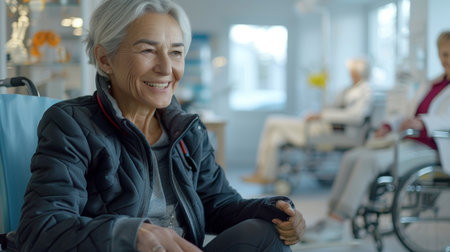 Elderly woman smiles warmly while sitting in a rehabilitation center, surrounded by other patients in wheelchairs.