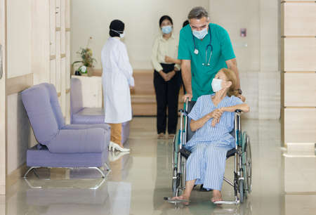 old patient on bed with doctor holding hands for nursing, medical health care