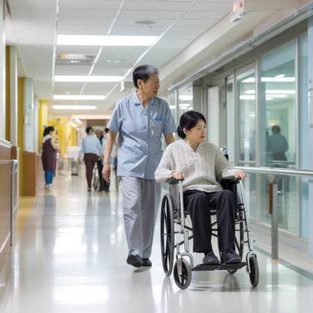 Elderly person using a walking aid with a relative or caregiver in a hospital hallway, AI generative photorealistic illustration
