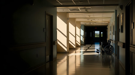 An empty hospital corridor with sunlight streaming through windows, casting long geometric shadows on the floor. A lone wheelchair sits parked against the wall, evoking themes of healthcare, recovery, and quiet solitude.