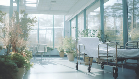 AI Generative Interior bright hospital room in medical clinic, healthcare and recovery after surgery or illnes