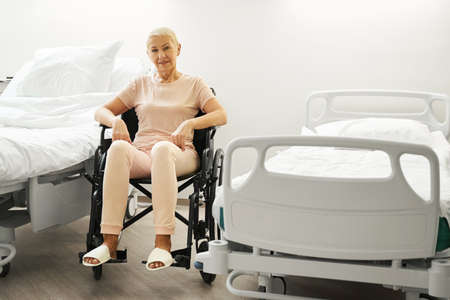 Female wheelchair user staring at camera between two beds
