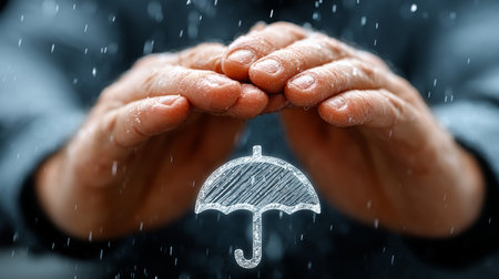 Close-up of hands shielding a drawn umbrella symbol, conveying protection in the rain.