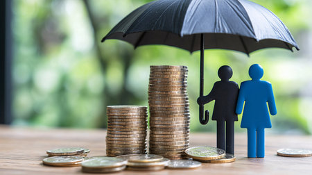 A hand holds an umbrella over wooden peg figures, illustrating the concept of business and family protection, emphasizing security and essential risk management.