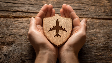 Travel insurance concept shield protection safety hands wood airplane secure policy coverage risk guard security symbol care