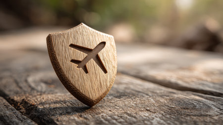 Wooden shield with airplane cutout symbolizing travel protection on rustic wooden surface with soft background