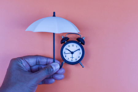 White umbrellas and alarm clock on pink background combine symbols of protection and time in a minimalist, visually striking composition.