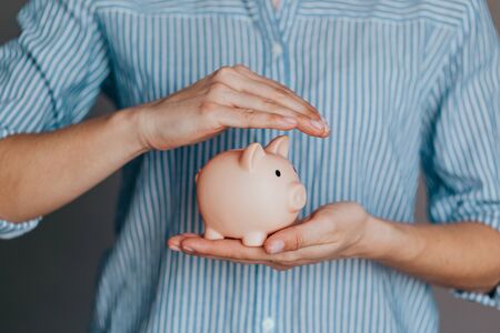 Woman holding a pink piggy bank, copy space next to her. Concept of saving money or savings