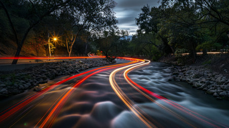 the flow of water in a river or the light trails of cars on the road at night generative ai
