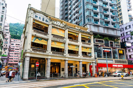 Busy Wan Chai street with Wo Cheong Pawnshop in Hong Kong. It is one of the busy business zones in Hong Kong