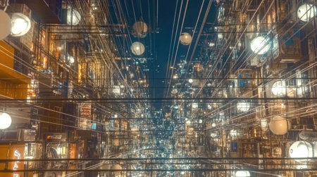 Overhead View of Neon-lit Lanterns in Urban Setting, Futuristic Market Scene, Cyberpunk Evening