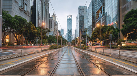 Captivating urban scene featuring tram tracks leading through a modern city, surrounded by tall skyscrapers under evening light, capturing a tranquil yet bustling atmosphere.