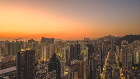 An impressive aerial view showcasing a densely packed urban landscape of high-rise buildings in Hong Kong, highlighting the dynamic streets and vibrant architecture.