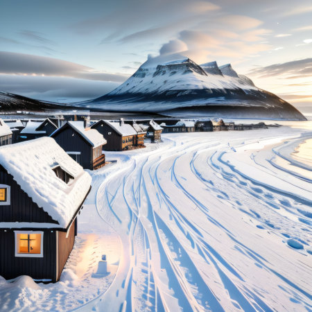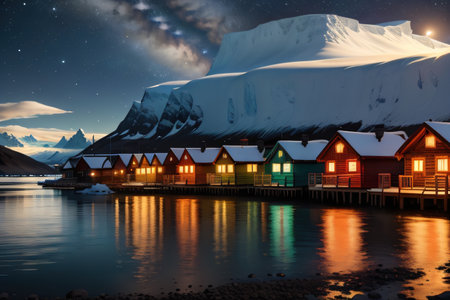 Enchanting Arctic landscape of a Greenlandic row of colorful wooden houses in moonlit silhouette showcases tranquility and indigenous