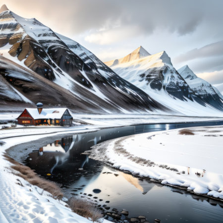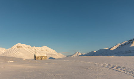 Small cabin in the arctic winter landscape with snow covered mountains on Svalbard, Norway