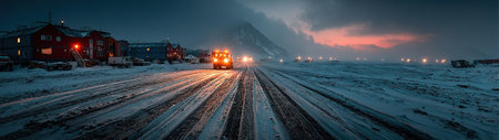 Features a panorama of an arctic industrial setup at dusk, with illuminated vehicles on snow laden terrain, set against mountain background and dark sky.