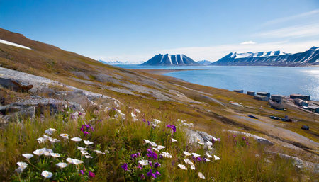 Mountain landscape with flowers in the foreground, Svalbard, Norway