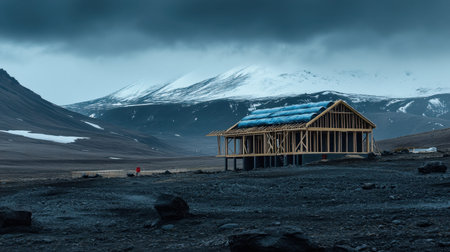 A wooden construction stands isolated against a backdrop of dramatic gray clouds and snowy mountains, showcasing resilient architecture in a rugged landscape.