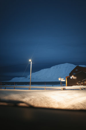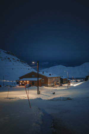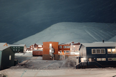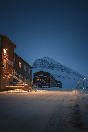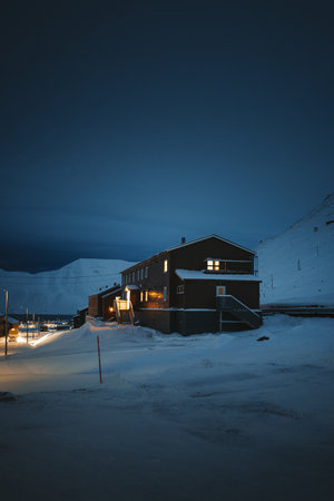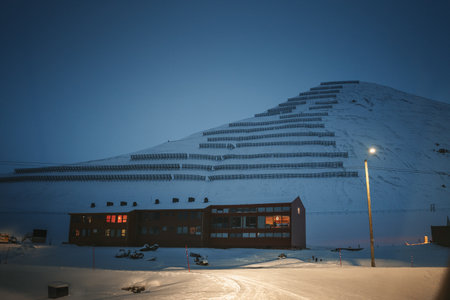 Snowy arctic mountain behind building in the polar night, Longyearbyen, Svalbard