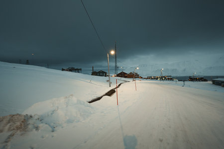 Snowy road in Longyearbyen, Svalbard in the polar night in winter