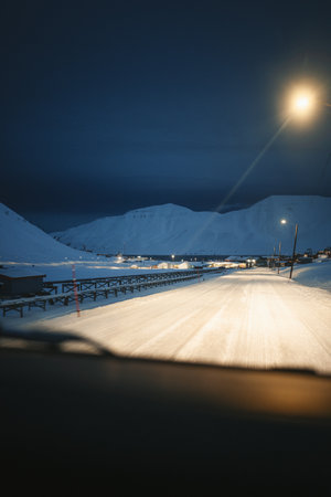 Driving towards Longyearbyen town center in Svalbard in the arctic polar night