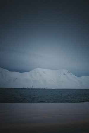 Landscape of snowy mountains by the arctic ocean, Svalbard