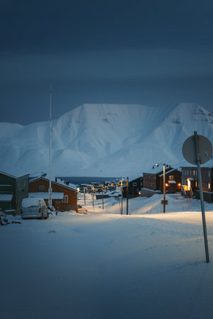 Snowy arctic landscape in Longyearbyen, Svalbard in the winter polar night