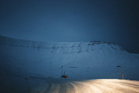Icy road up to Gruve 3 in Longyearbyen, Svalbard in the polar night