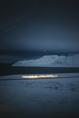 Polar night view of Longyearbyen, Svalbard in front of snowy arctic fjord