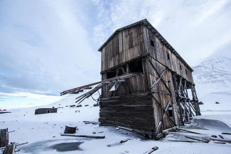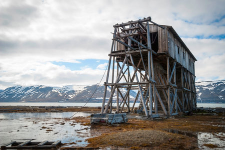 Abandoned wooden coal mine transportation station in Svalbard, Norway