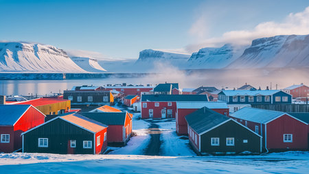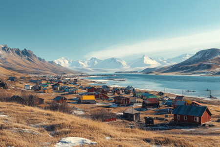 Traditional wooden houses dot the landscape of a remote arctic village, overlooking a serene bay with snow-capped mountains in the background