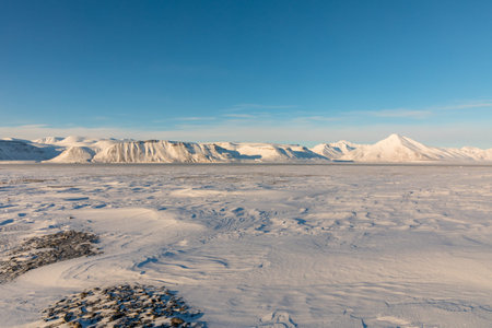Snowy arctic mountains in winter by fjord in Longyearbyen, Svalbard