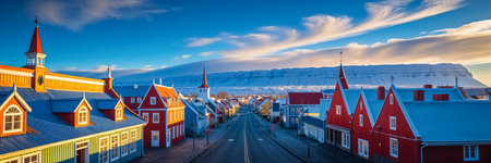 View over colourful greenland houses of Disko Island, arctic city of Qeqertarsuaq. Located in the disko bay. Blue sky and sunny day. Table mountains in Background.