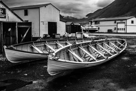 Landscape in the town of Ólafsfjörður in the north of Iceland. You can see abandoned boats in the old port.