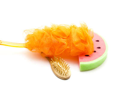 washcloth, bathing brush and heel foam. concept of accessories for shower, bath and spa salon