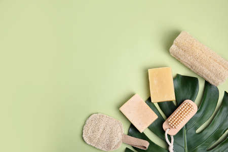 Natural loofah sponges on green background, flat lay