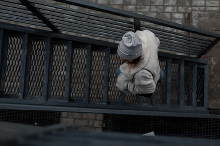 young modern woman in fashionable warm knitted clothes on a metal staircase. Stylish girl goes along iron steps. Spring time. Youth fashion. Top view
