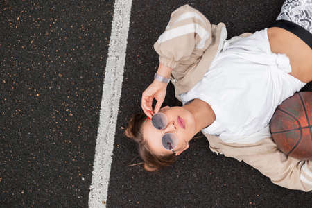 Fashionable beautiful young woman sporty model in fashionable retro clothes with windbreaker, t-shirt and leggings with a ball lying on the pavement and adjusting sunglasses, top view