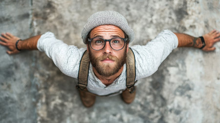 A trendy young man with a beard and glasses poses confidently against an urban background. His arms are open, inviting a sense of freedom and joy.