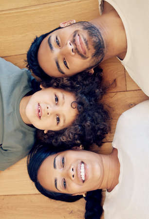 Top view of a group of friends lying on the floor and looking at the camera