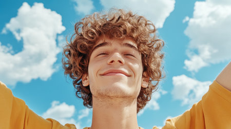 A young man with curly hair and a yellow bandana stands outdoors, smiling dreamily under a dramatic cloudy sky, capturing a moment of pure joy and tranquility.