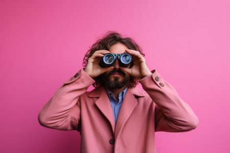 Taking a closer look Long angle view of handsome young bearded man looking through binoculars away : Generative AI
