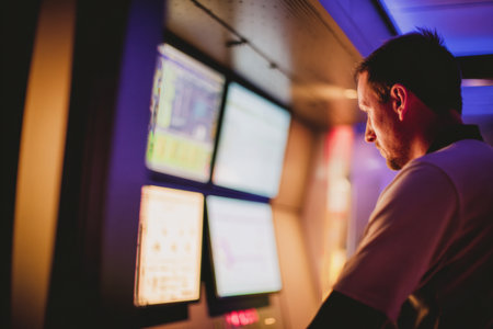 A technician monitoring renewable energy systems in modern control room, focused and engaged